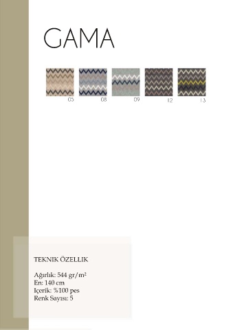 GAMA 05 08 09 12 13 TEKNIK ÖZELLIK Ağırlık: 544 gr/m² En: 140 cm Içerik: %100 pes Renk Sayısı: 5