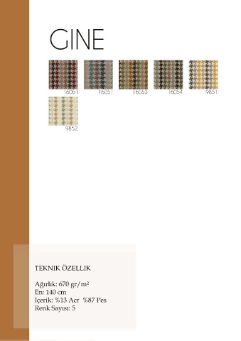 GINE 16051 16051 16053 16054 9851 9852 TEKNIK ÖZELLIK Ağırlık: 670 gr/m² En: 140 cm Içerik: %13 Acr %87 Pes Renk Sayısı: 5