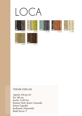 LOCA 2055 5048 9048 10048 11048 1049 1055 TEKNİK ÖZELLİK Ağırlık: 630 gr/m² En: 140 cm Içerik: %100 Pes Kumaş Türü: Keten Tarzında Desen: Egzotik Kullanım: Döşemelik Kullanım: Döşemelik Renk Sayısı: 5