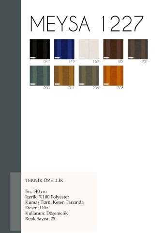 MEYSA 1227 042 149 162 182 201 203 204 206 208 TEKNİK ÖZELLİK En: 140 cm Içerik: %100 Polyester Kumaş Türü: Keten Tarzında Desen: Düz Kullanım: Döşemelik Renk Sayısı: 25 Renk Sayısı: 25