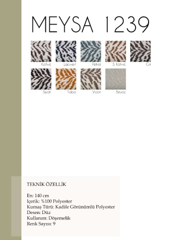 MEYSA 1239 Kahve Lacıvert Petrol S. Kahve Gri Siyah Taba Vizon Beyaz TEKNİK ÖZELLİK En: 140 cm Içerik: %100 Polyester Kumaş Türü: Kadife Görünümlü Polyester Desen: Düz Kullanım: Döşemelik Renk Sayısı: 9 Renk Sayısı: 9