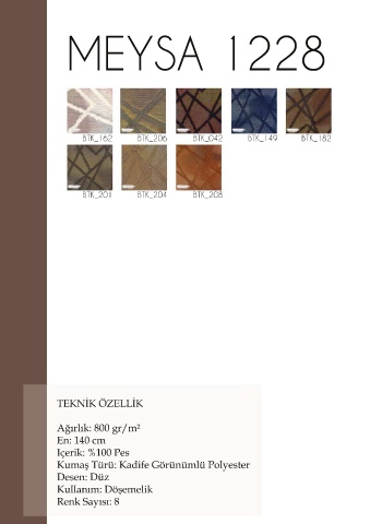 MEYSA 1228 BTK_162 BTK_206 BTK_042 BTK_149 BTK_182 BTK_201 BTK_204 BTK_208 TEKNİK ÖZELLİK Ağırlık: 800 gr/m² En: 140 cm Içerik: %100 Pes Kumaş Türü: Kadife Görünümlü Polyester Desen: Düz Kullanım: Döşemelik Kullanım: Döşemelik Renk Sayısı: 8