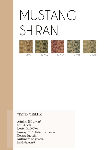 MUSTANG SHIRAN 12-V01 12-V03 12-V04 12-V05 12-V06 TEKNİK ÖZELLİK Ağırlık: 280 gr/m² En: 140 cm Içerik: %100 Pes Kumaş Türü: Keten Tarzında Desen: Egzotik Kullanım: Döşemelik Kullanım: Döşemelik Renk Sayısı: 5
