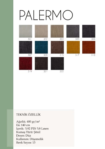 PALERMO 301 302 303 305 306 307 309 315 317 318 319 321 322 TEKNİK ÖZELLİK Ağırlık: 400 gr/m² En: 140 cm Içerik: %92 PES %8 Lınen Kumaş Türü: Şönil Desen: Düz Kullanım: Döşemelik Kullanım: Döşemelik Renk Sayısı: 13