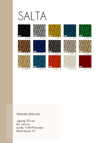 SALTA Black K-3-3 K-9-4 K-13-3 K-292-1 K-293-1 K-295-1 K-296-2 K-297-2 K-298-3 K-299-4 K-300-2 K-301-1 K-306-2 K-311-3 TEKNIK ÖZELLIK Ağırlık: 571 m² En: 140 cm Içerik: %100 Polyester Renk Sayısı: 15