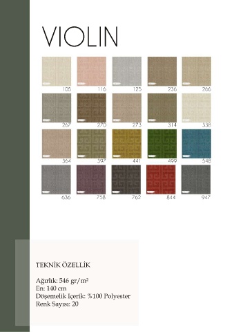 VIOLIN 105 116 125 236 266 267 270 273 314 338 364 397 441 499 548 636 758 762 844 947 TEKNİK ÖZELLİK Ağırlık: 546 gr/m² En: 140 cm Döşemelik Içerik: %100 Polyester Renk Sayısı: 20
