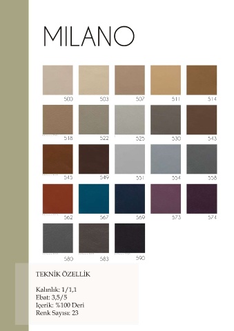 MILANO 500 503 507 511 514 518 522 525 530 543 545 549 551 554 558 562 567 569 573 574 580 583 590 TEKNİK ÖZELLİK Kalınlık: 1/1,1 Ebat: 3,5/5 Içerik: %100 Deri Renk Sayısı: 23