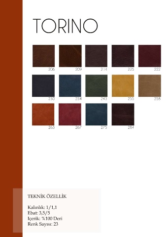 TORINO 206 209 214 225 222 230 234 243 255 258 263 267 275 284 TEKNİK ÖZELLİK Kalınlık: 1/1,1 Ebat: 3,5/5 Içerik: %100 Deri Renk Sayısı: 23