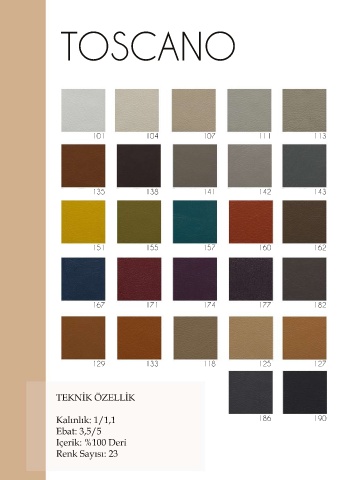 TOSCANO 101 104 107 111 113 135 138 141 142 143 151 155 157 160 162 167 171 174 177 182 129 133 118 125 127 TEKNİK ÖZELLİK Kalınlık: 1/1,1 186 190 Ebat: 3,5/5 Içerik: %100 Deri Renk Sayısı: 23