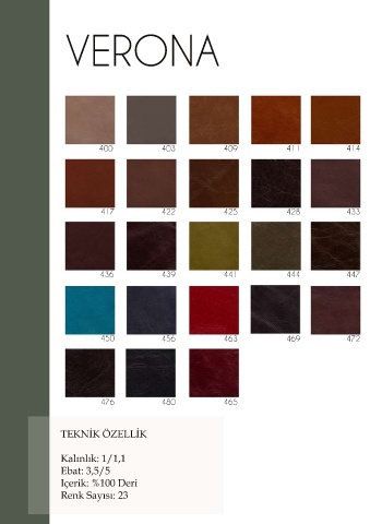 VERONA 400 403 409 411 414 417 422 425 428 433 436 439 441 444 447 450 456 463 469 472 476 480 465 TEKNİK ÖZELLİK Kalınlık: 1/1,1 Ebat: 3,5/5 Içerik: %100 Deri Renk Sayısı: 23
