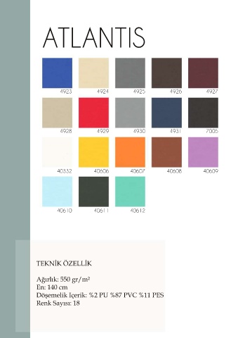 ATLANTIS 4923 4924 4925 4926 4927 4928 4929 4930 4931 7005 40332 40606 40607 40608 40609 40610 40611 40612 TEKNİK ÖZELLİK Ağırlık: 550 gr/m² En: 140 cm Döşemelik Içerik: %2 PU %87 PVC %11 PES Renk Sayısı: 18
