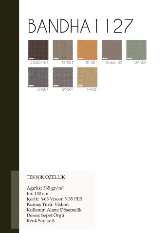 BANDHA1127 230854-01 AY-001 BK-001 Duman-02 GM-001 LY-001 SY-001 TY-001 TEKNİK ÖZELLİK Ağırlık: 365 gr/m² En: 140 cm Içerik: %65 Vıscon %35 PES Kumaş Türü: Viskon Kullanım Alanı: Döşemelik Desen: Sepet Örgü Desen: Sepet Örgü Renk Sayısı: 8