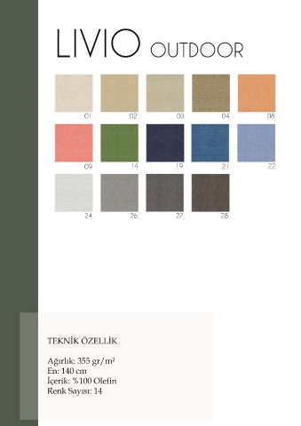 LIVIO OUTDOOR 01 02 03 04 08 09 14 19 21 22 24 26 27 28 TEKNİK ÖZELLİK Ağırlık: 355 gr/m² En: 140 cm İçerik: %100 Olefin Renk Sayısı: 14
