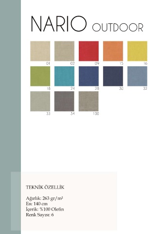 NARIO OUTDOOR 01 02 09 15 16 18 24 28 30 32 33 34 100 TEKNİK ÖZELLİK Ağırlık: 263 gr/m² En: 140 cm İçerik: %100 Olefin Renk Sayısı: 6